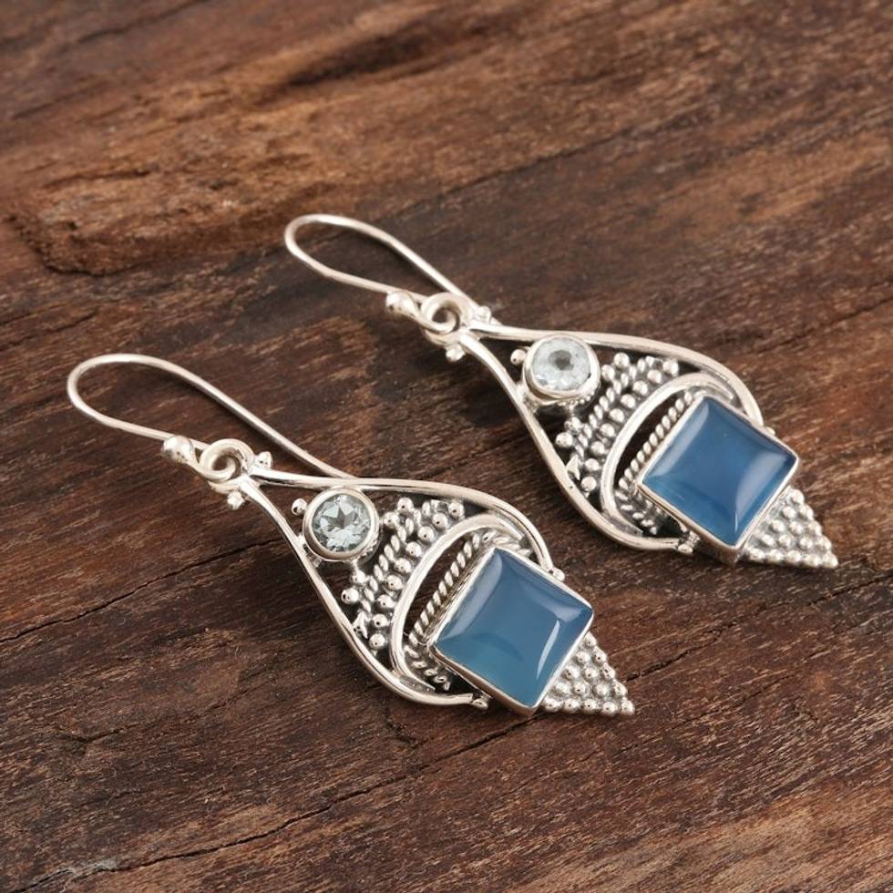 Chalcedony Cabochon and Sterling Silver Dangle Earrings 'Oceans of Blue' Item ID: 2671623691