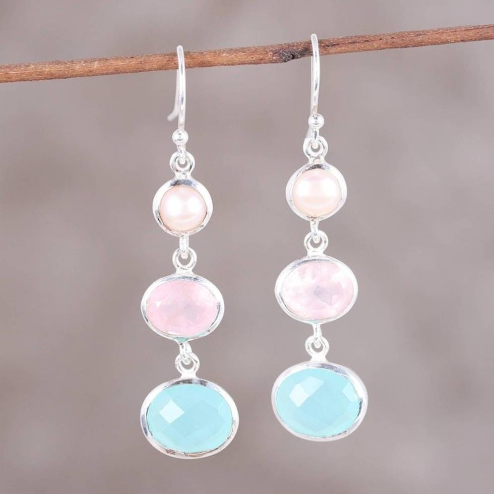 Chalcedony Rose Quartz and Pearl Earrings from India 'Lovely Trio' Item ID: 2671791127