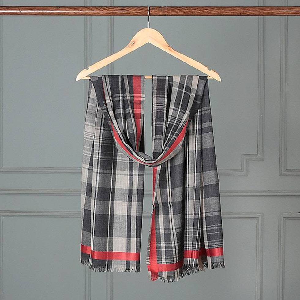 Checkered Plaid Tartan Fringed Wool Shawl with Red Borders 'Checkered Elegance' Item ID: 2676666234