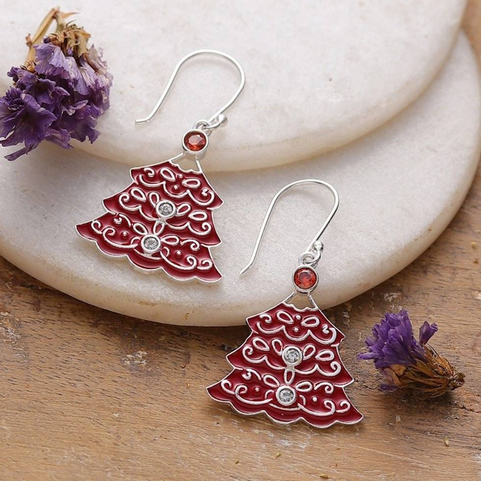 Christmas Tree-Shaped Crimson Cubic Zirconia Dangle Earrings 'Crimson Christmas' Item ID: 2671625277