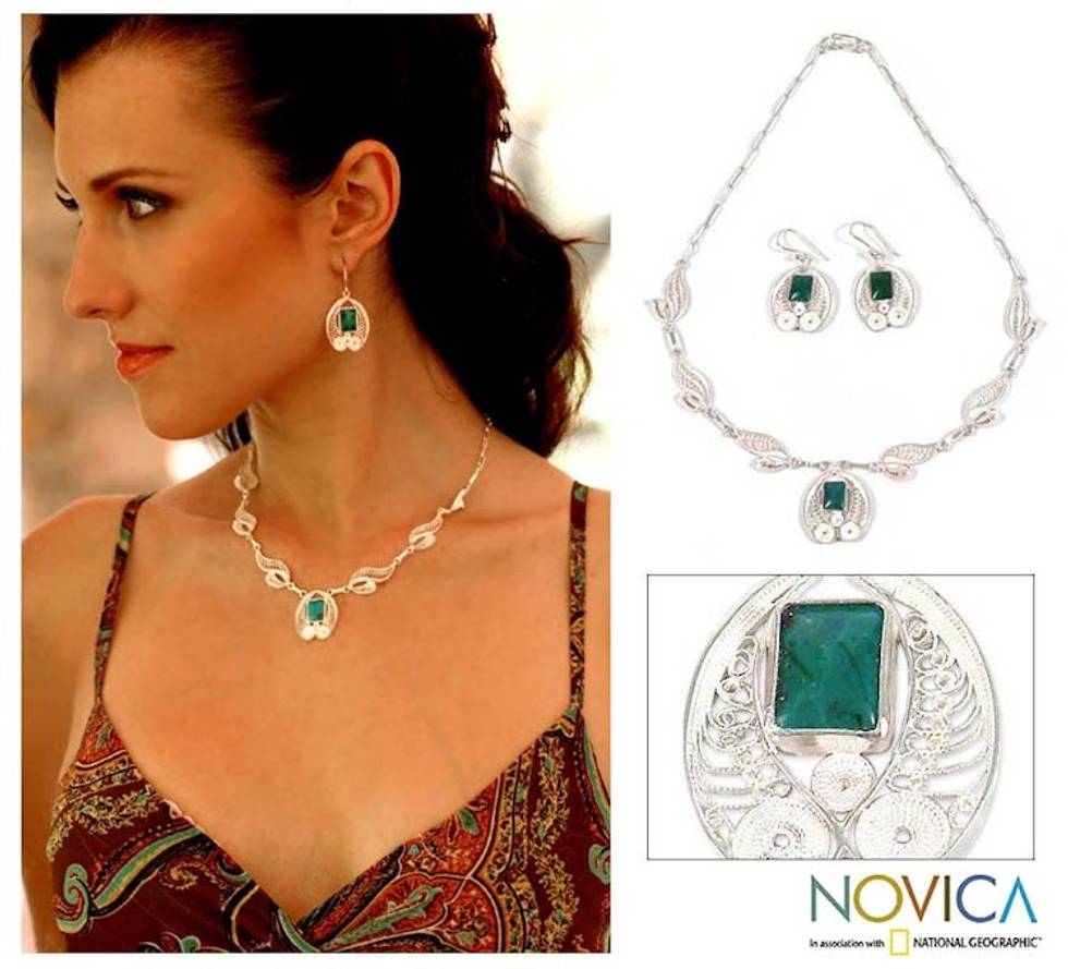 Chrysocolla Silver Necklace And Earrings Jewelry Set 'Leaves' Item ID: 2671689542