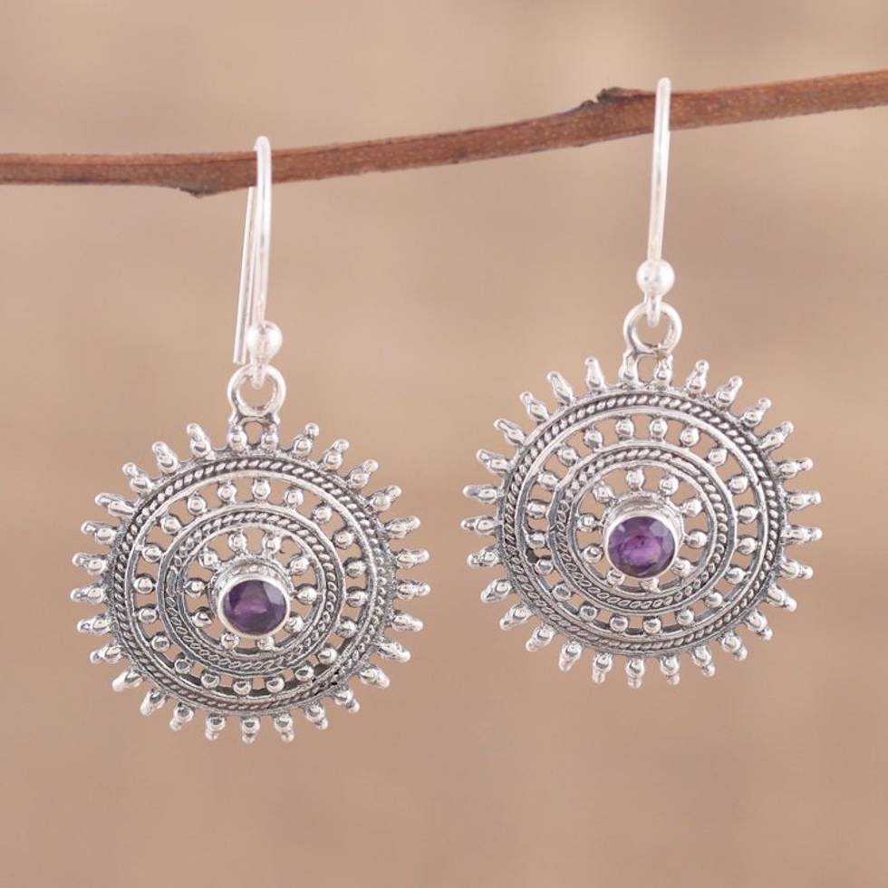 Circular Amethyst Dangle Earrings from India 'Sunshine Discs' Item ID: 2671790391
