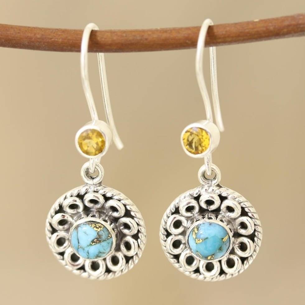 Circular Citrine and Composite Turquoise Dangle Earrings 'Striking Beauty' Item ID: 2671789379