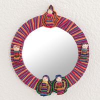 Circular Cotton Wall Mirror with Worry Dolls from Guatemala 'Quitapenas Reflection' Item ID: 2671777024