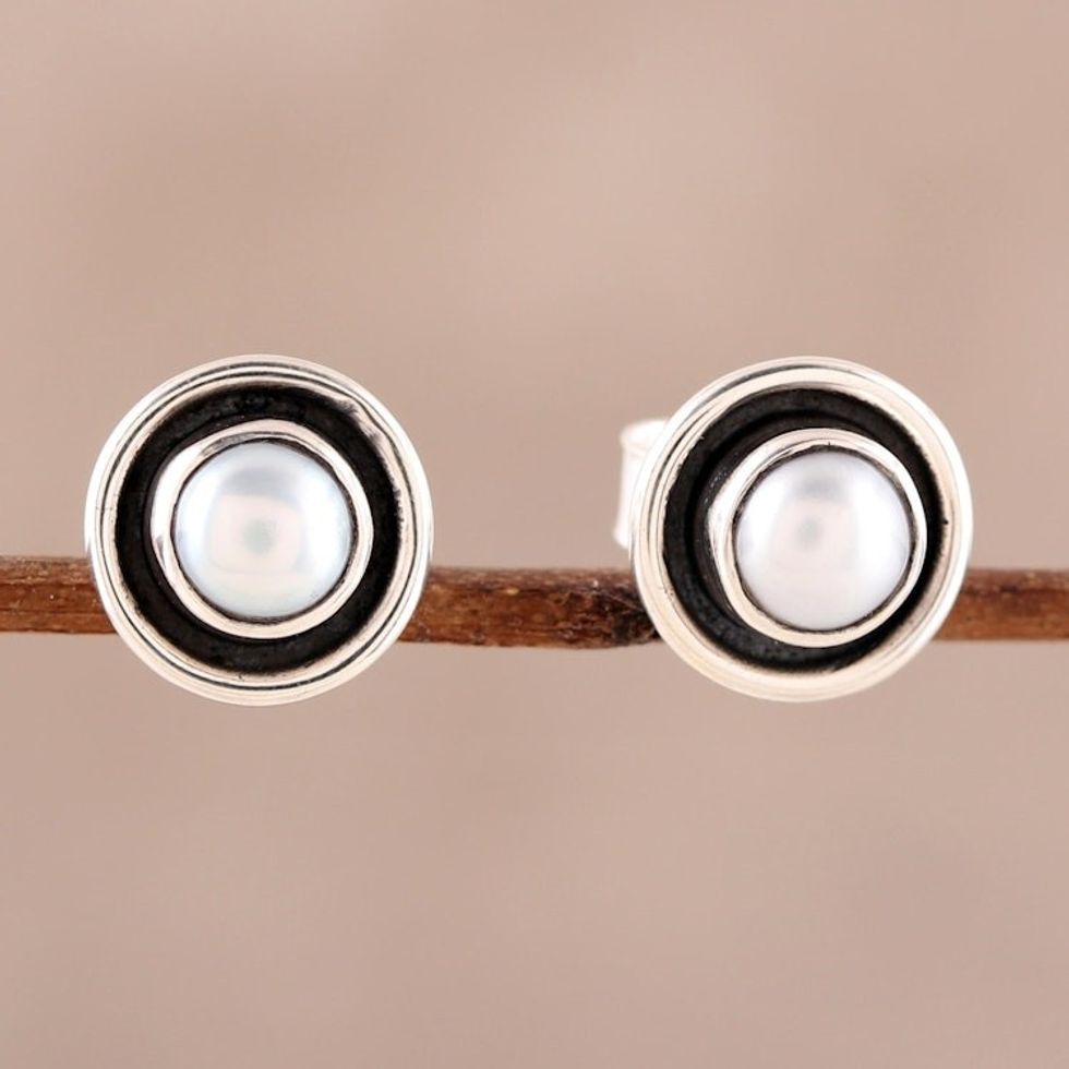 Circular Cultured Pearl Stud Earrings from India 'Graceful Frames' Item ID: 2671792823