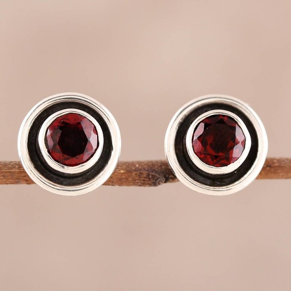 Circular Faceted Garnet Stud Earrings from India 'Framed Sparkle' Item ID: 2671792356