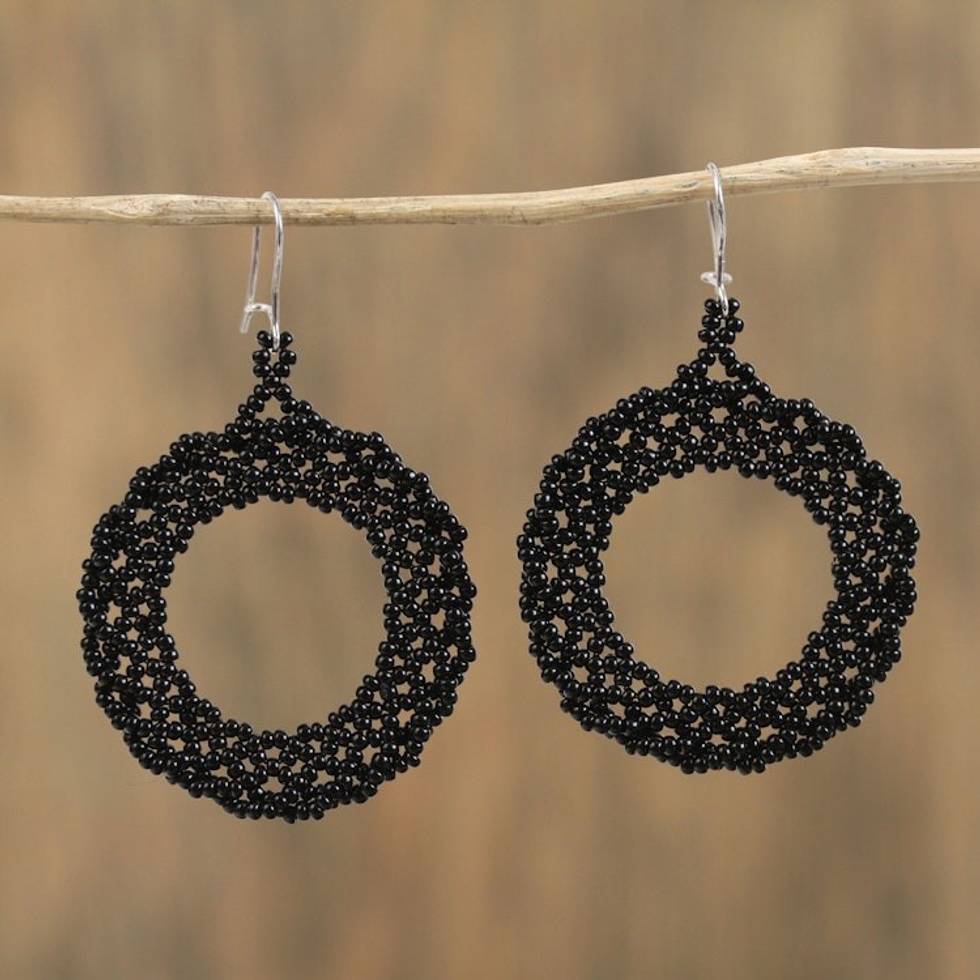 Circular Glass Beaded Dangle Earrings in Black from Mexico 'Ebony Black Circles' Item ID: 2669932404