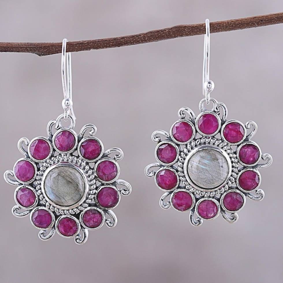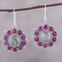 Circular Labradorite and Agate Dangle Earrings from India 'Goddess Blooms' Item ID: 2669923816