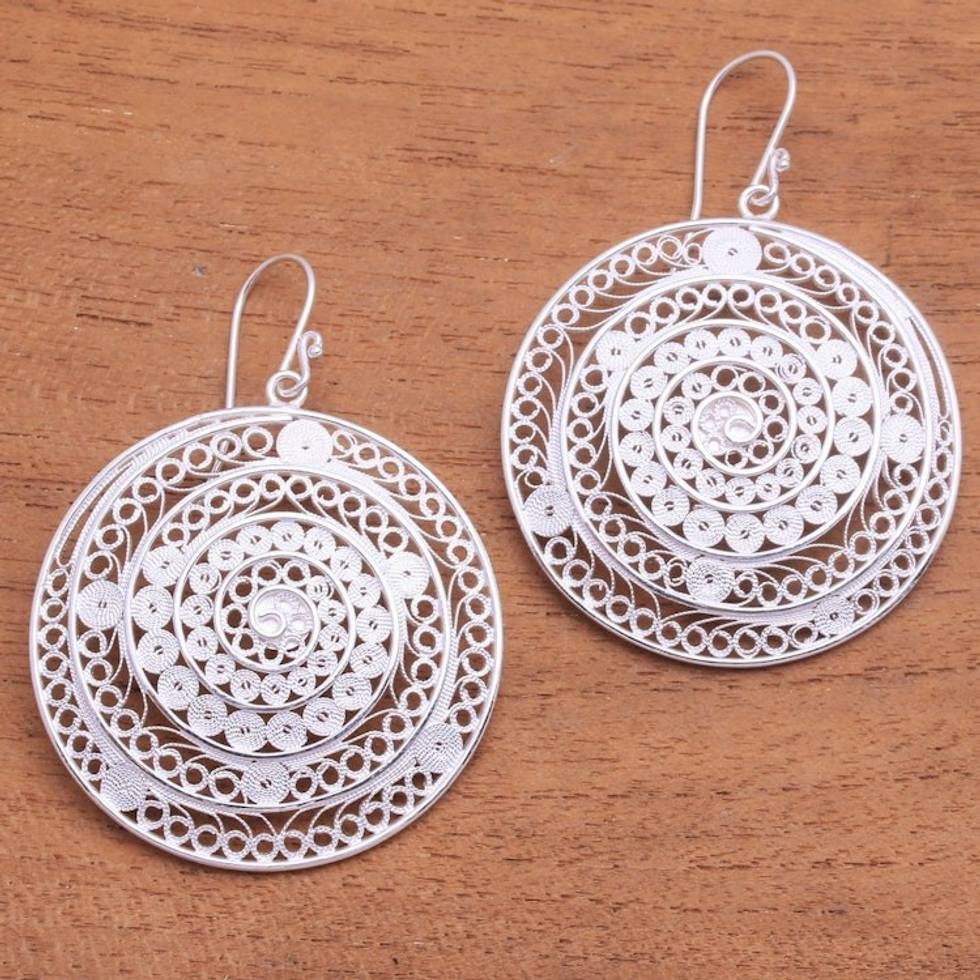 Circular Sterling Silver Filigree Dangle Earrings from Java 'Elegant Shields' Item ID: 2671737104