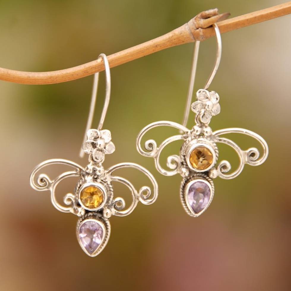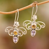Citrine and Amethyst Spiral Dangle Earrings from Bali 'Manggar Flowers' Item ID: 2671734601