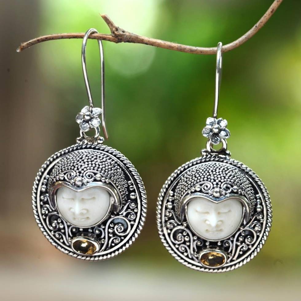 Citrine and Bone Dangle Earrings Crafted in Bali 'Sukawati Guardian' Item ID: 2671821575