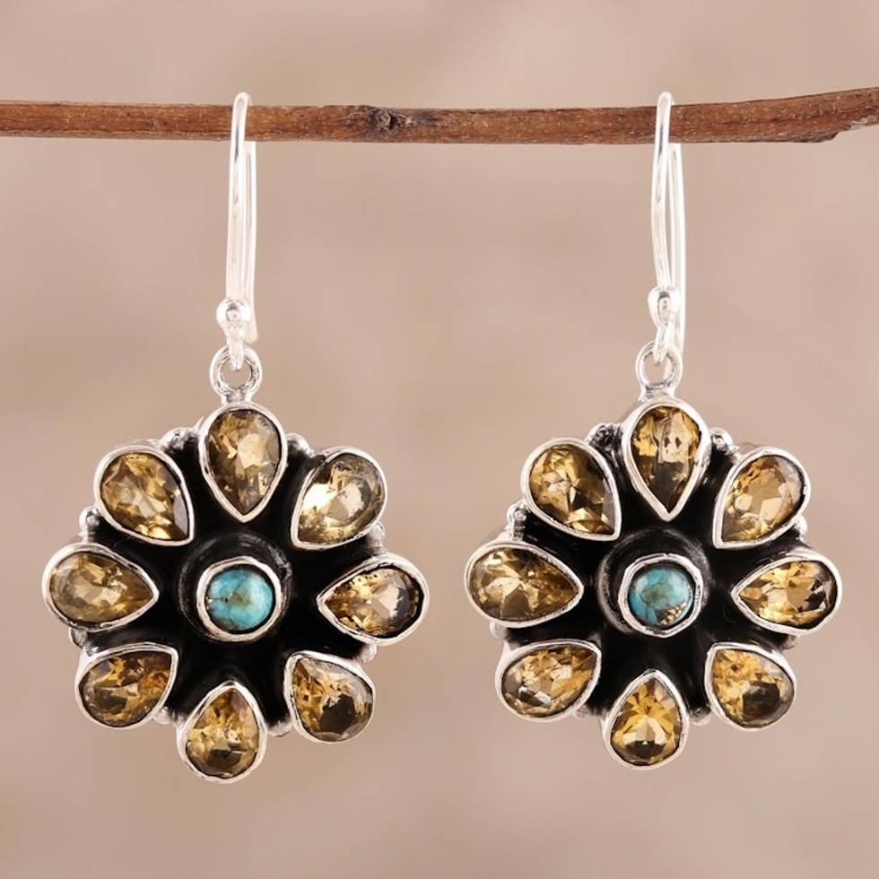 Citrine and Composite Turquoise Dangle Earrings from India 'Floral Glitter' Item ID: 2671792510