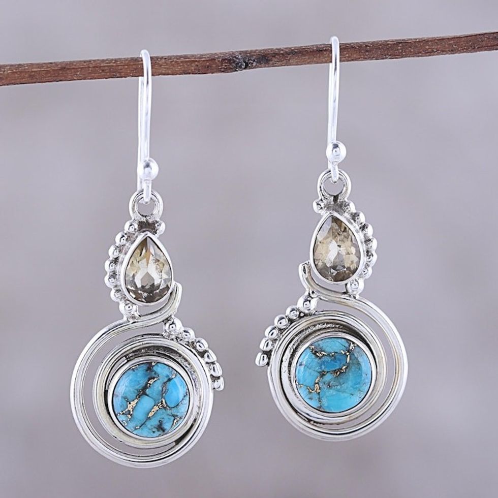Citrine and Composite Turquoise Dangle Earrings from India 'Magic Alliance' Item ID: 2671792455