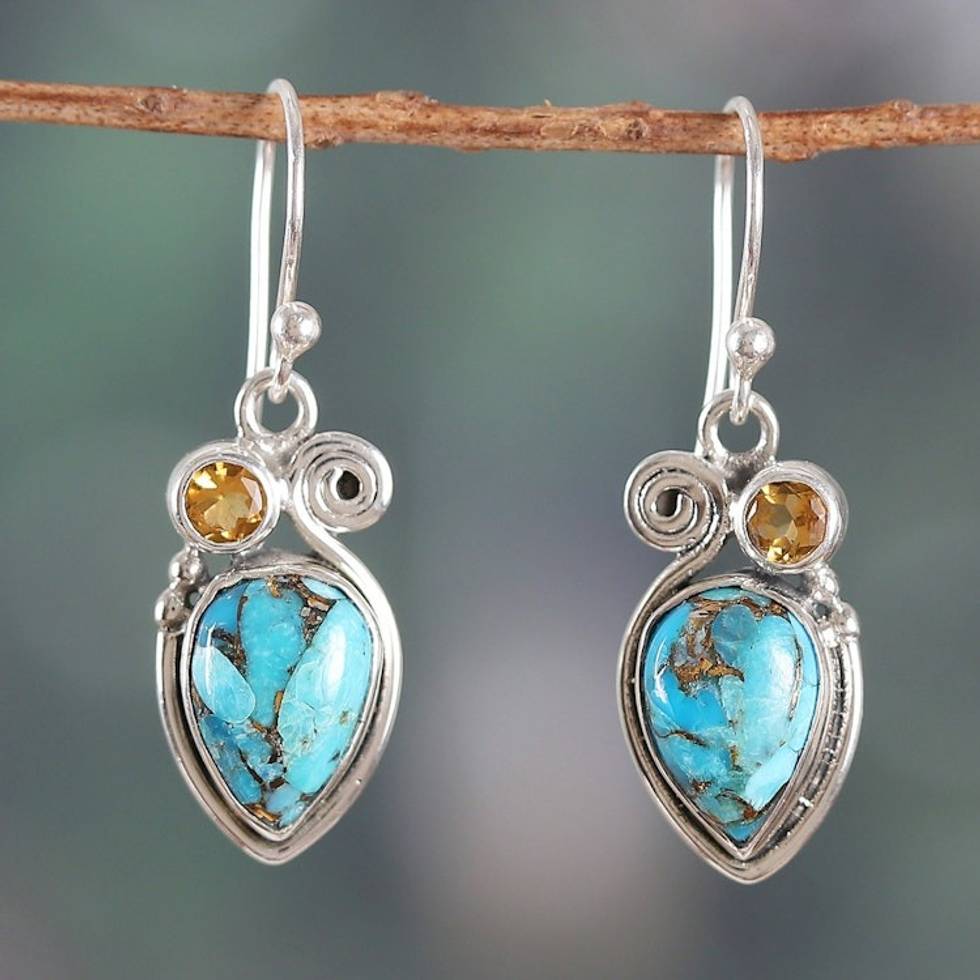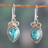 Citrine and Composite Turquoise Dangle Earrings from India 'Summer Success' Item ID: 2671782757