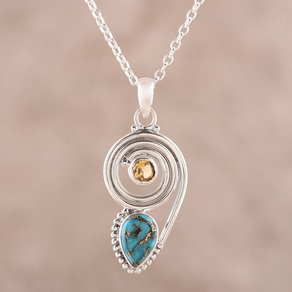 Citrine and Composite Turquoise Pendant Necklace from India 'Wondrous Coil' Item ID: 2671792295