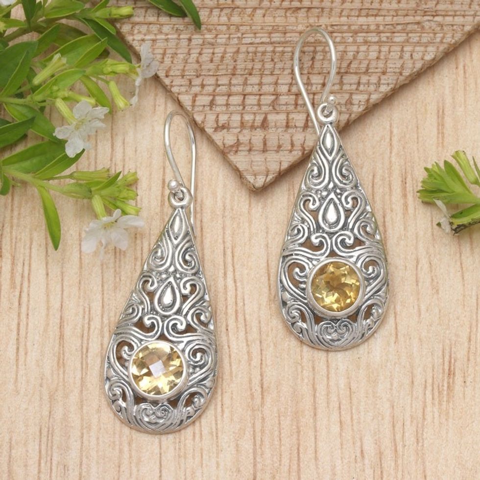 Citrine and Sterling Silver Dangle Earrings from Bali 'Temple Teardrops' Item ID: 2671733231