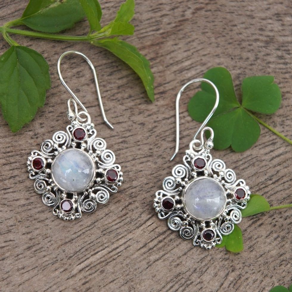 Classic 2-Carat Garnet and Rainbow Moonstone Dangle Earrings 'Lunar Passion' Item ID: 2671765266