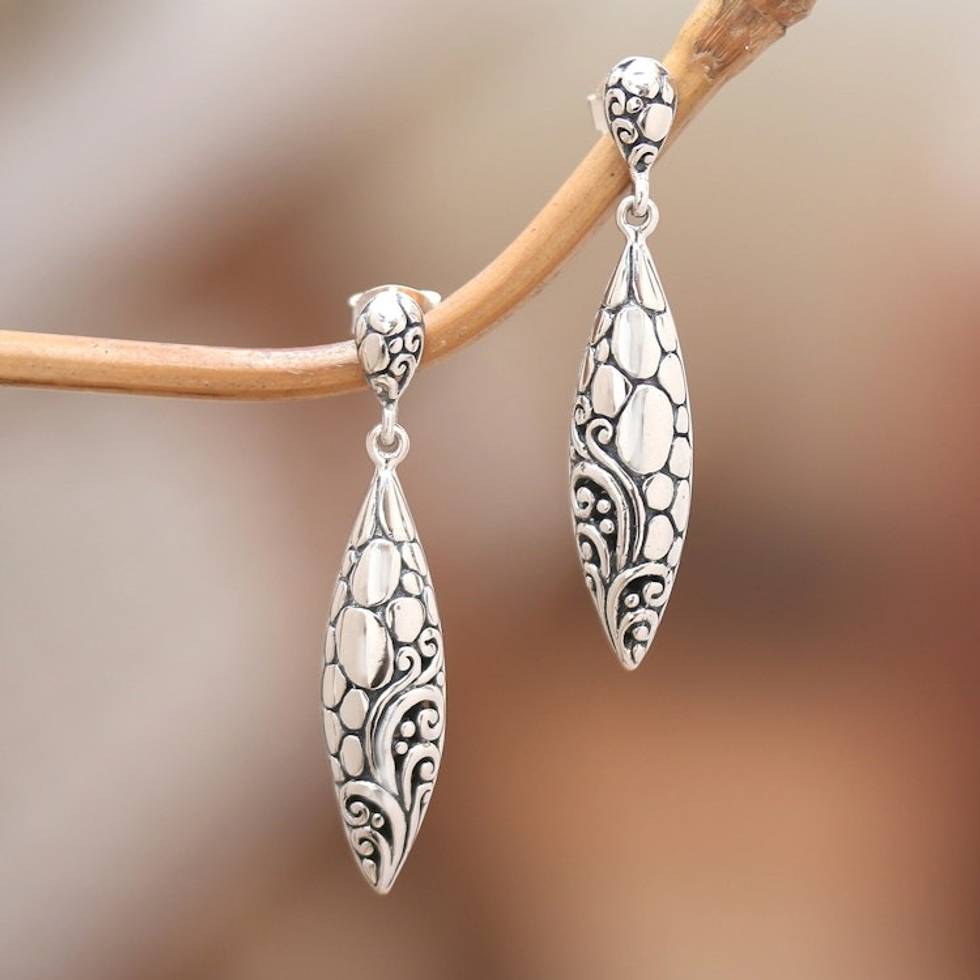 Classic Balinese Leaf-Shaped Sterling Silver Dangle Earrings 'Goddess' Essence' Item ID: 2671765209