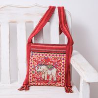 "Accented with Thailand's traditional arts, this sling comes to add uniqueness to your days. Kunlaya Pangsiri's newest design features a combination of polyester and cotton yarns that allow for a vibrant bag equipped with comfortable straps. As a touch of convenience, the interior—equipped with two pockets—has a zipper closure. Finally, a classic elephant scene decorates the front, combining red hues with graceful stripes for a bold look."