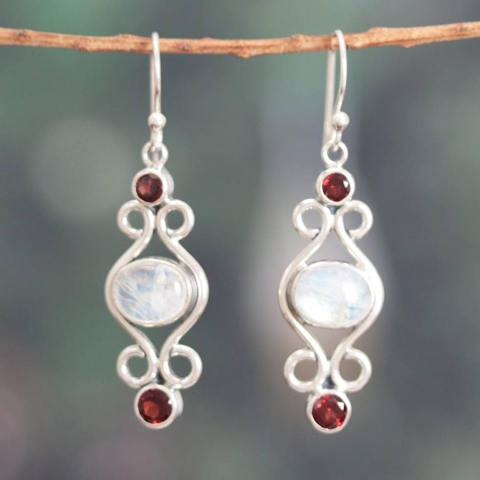 Classic Natural Rainbow Moonstone and Garnet Dangle Earrings 'Moony Love' Item ID: 2671625607