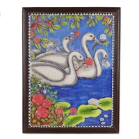 "A tranquil lagoon scene awakens tender and celestial sensations, making Neelima Gupta's newest relief artwork a piece of excellence. Crafted in the luxurious Indian lands, this marble dust wall wart intends to convey peaceful vibes through the graceful details that compose the scene: elegant swans, bright leaves and charming flowers.