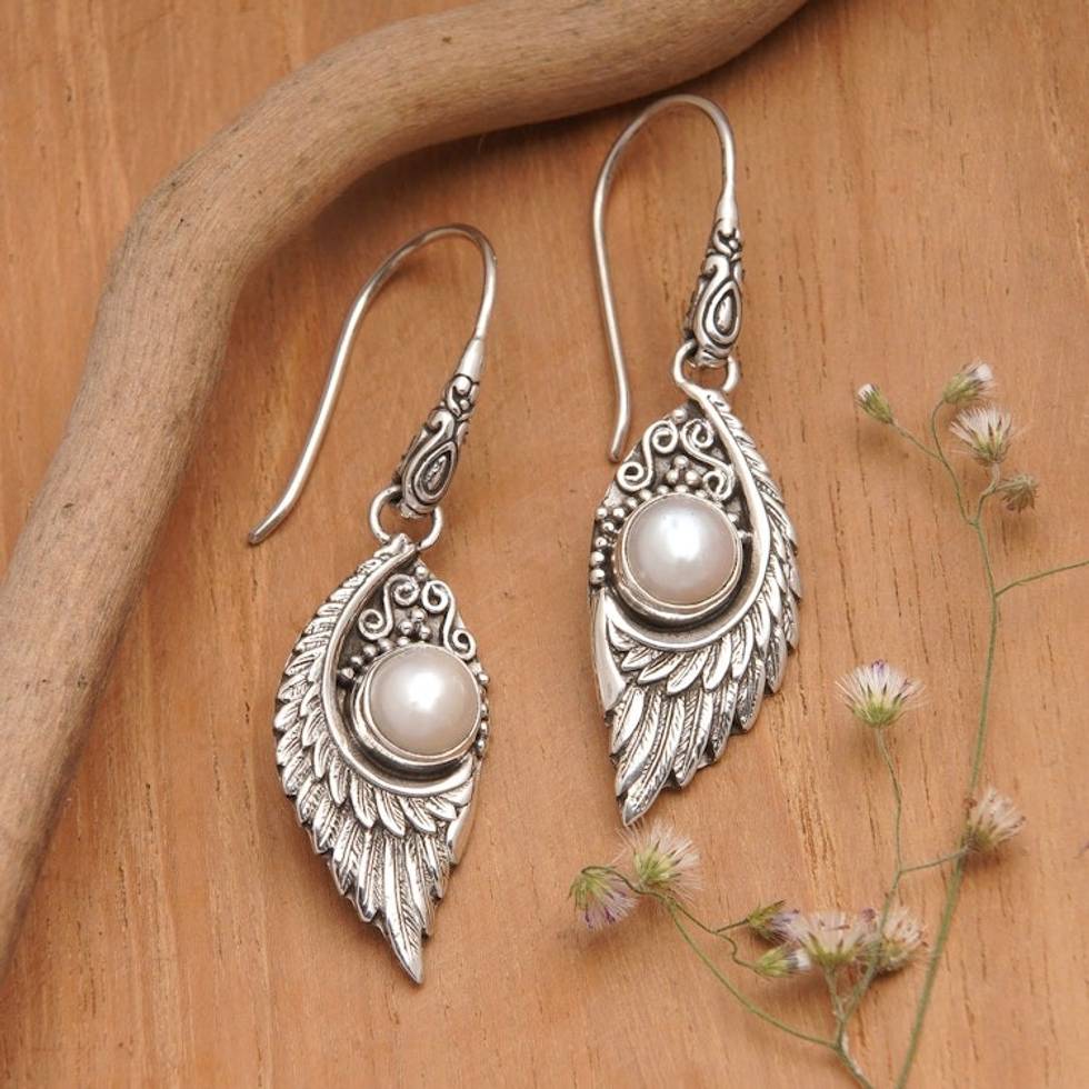 Classic Sterling Silver Dangle Earrings with White Pearls 'Pearly Swan' Item ID: 2671764583