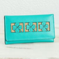 Clover Theme Jute Trim Turquoise Leather Wallet 'Turquoise Lucky Clover' Item ID: 2671772136