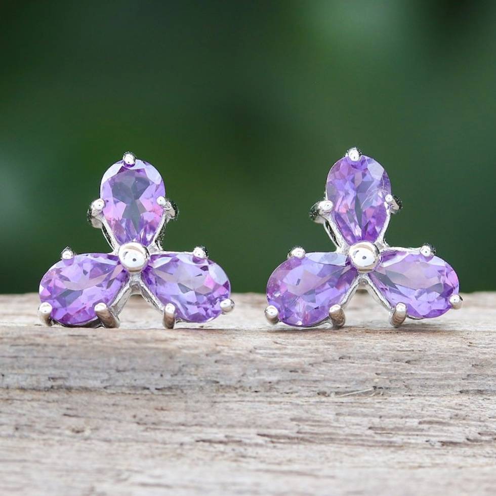 Clover-Themed Button Earrings with Two-Carat Amethyst Gems 'Wisdom Clover' Item ID: 2671797931