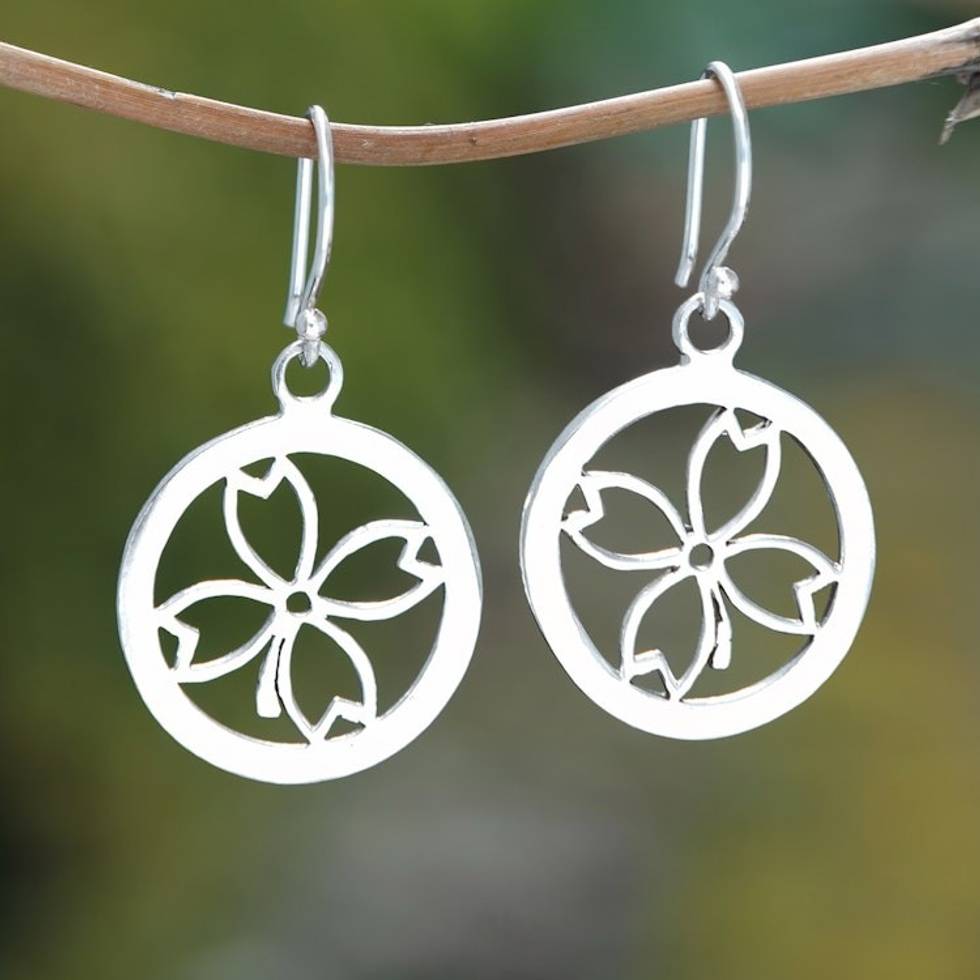 Clover-Themed Round Sterling Silver Dangle Earrings 'Luck Emblem' Item ID: 2671764889