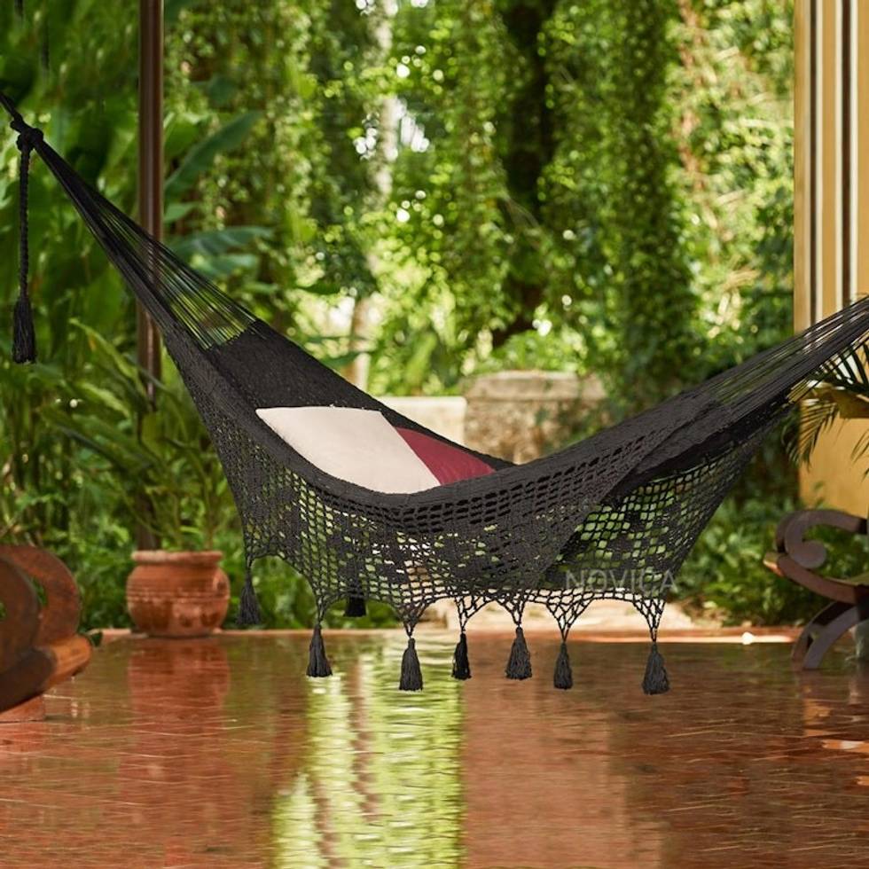 Coal Black Tasseled Cotton Hammock Triple from Mexico 'Veranda in Black' Item ID: 2671808090