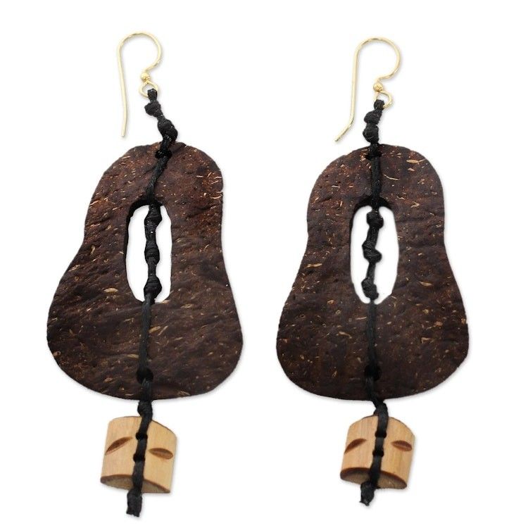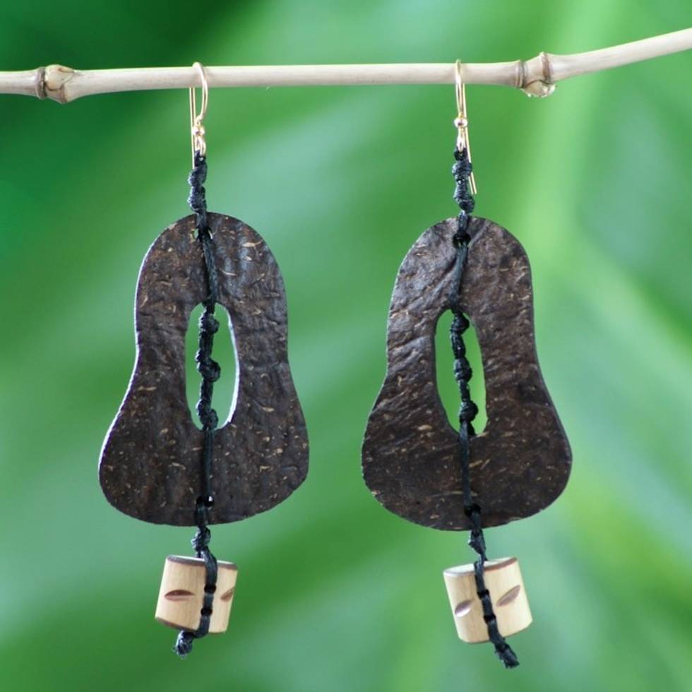 Coconut shell and bamboo dangle earrings 'Medieval Bells' Item ID: 2671807216