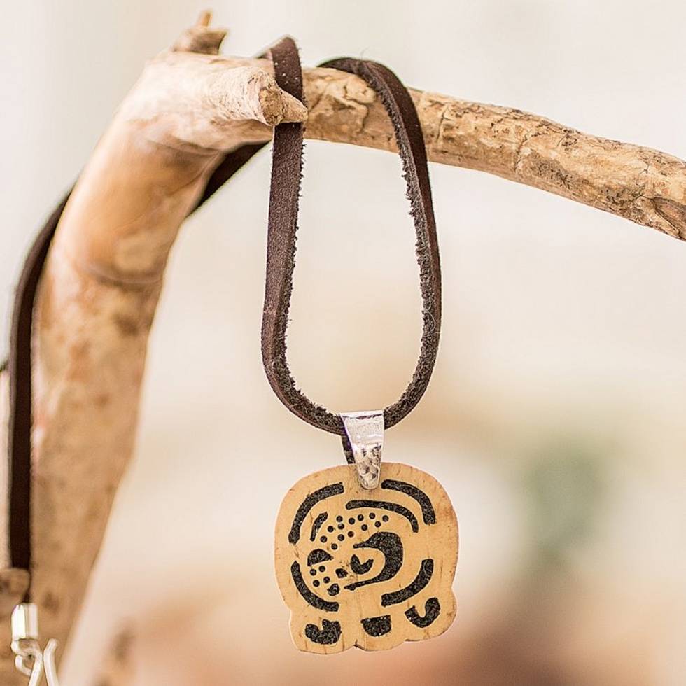 "Hand-carved from a piece of coconut shell, the image of the Kan sign decorates this necklace from Guatemala, aimed at those blessed by the snake spirit. Proud of their heritage, Fernando and David fill the cutaway section with lava stone for a stunning contrast, while a leather cord completes the design with comfort. The pendant is also a symbol of your inner fire, based on the ancient Mayan doctrine."