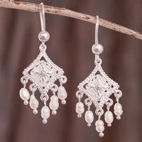 "Designed by Maria del Carmen Vargas in Peru, these earrings possess a colonial aesthetic. Two ornate squares are crafted from sterling silver, featuring cascades of glowing white cultured pearls that dangle below."