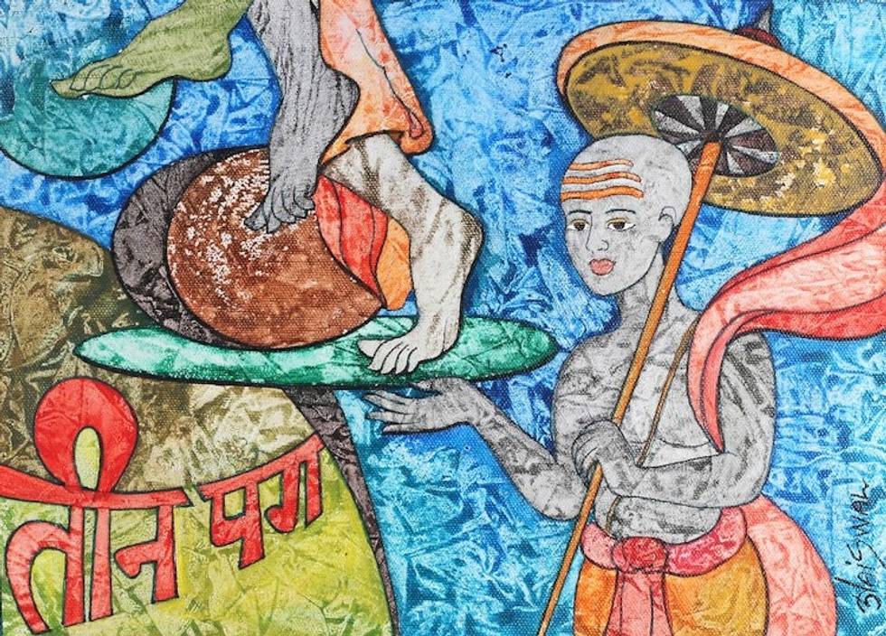 Colorful Acrylic on Canvas Vamana Avatar Painting from India 'Three Sacred Steps' Item ID: 2671781085
