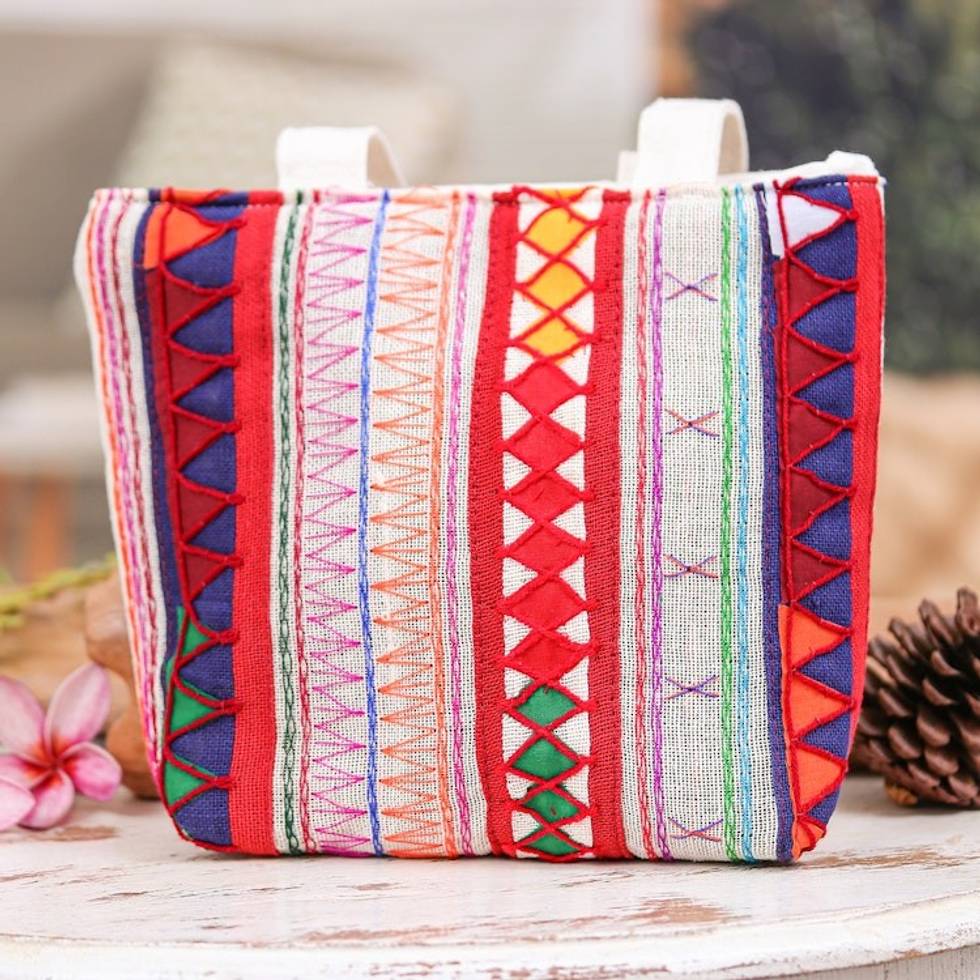 Colorful Cotton Tote Bag with Lahu Hill Tribe Embroidery 'Carnival of Colors' Item ID: 2671796695