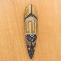 I was immediately attracted to the colors of this mask. They match my sofa and the painting hanging over it perfectly. And of course the expression of the mask is captivating. Sort of a sad face, but also a peaceful face. Love it!Superb crafting and imagination.Marsha