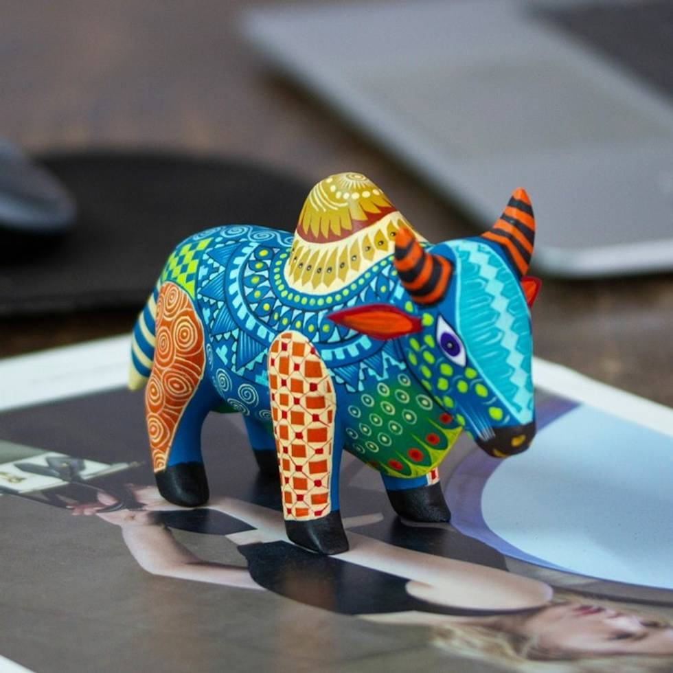 Colorful Hand-Painted Mexican Wood Alebrije Bull Figurine 'Invincible Bull' Item ID: 2671807577