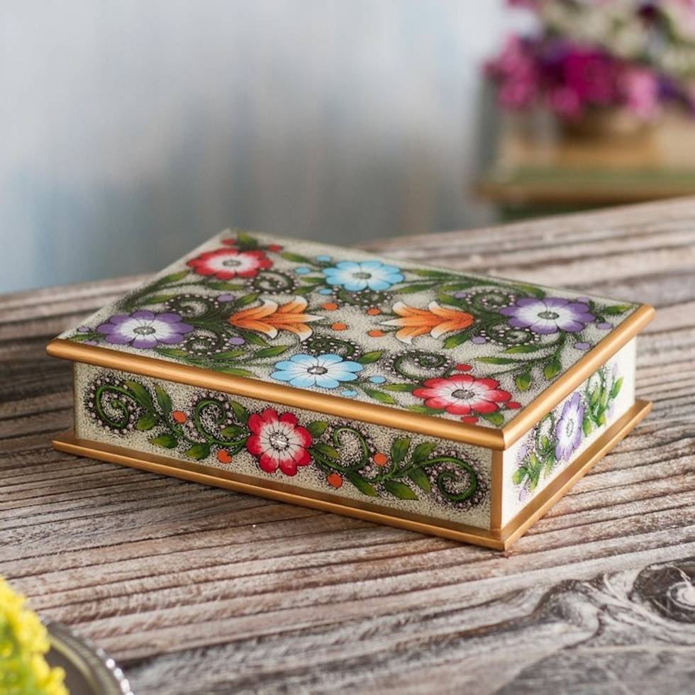 Colorful Reverse-Painted Glass Decorative Box from Peru 'Margarita Garden in White' Item ID: 2671400186