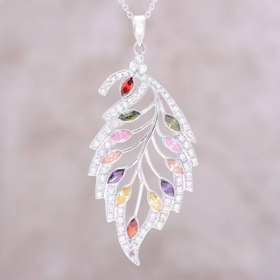 Colorful Rhodium Plated Sterling Silver Leaf Necklace 'Glittering Leaf' Item ID: 2671792489