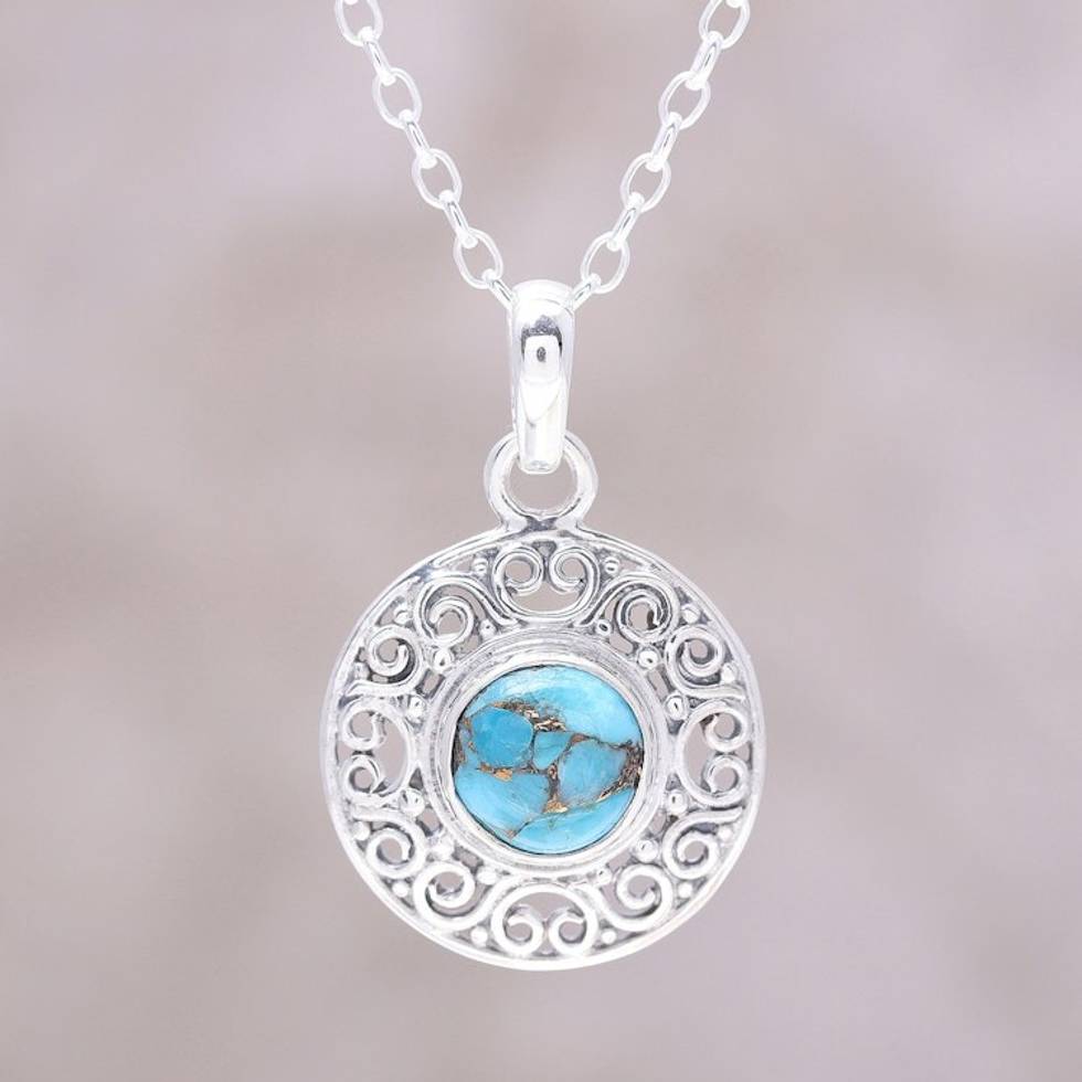 Composite Turquoise Sterling Silver Round Pendant Necklace 'Elegant Sea' Item ID: 2671619377