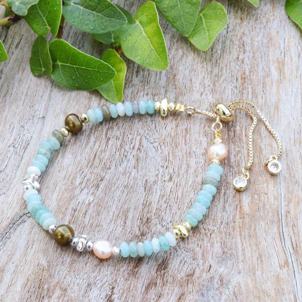 Cool-Palette Adjustable Multi-Gemstone Beaded Pearl Bracelet 'Aqua Pearl' Item ID: 2676648505