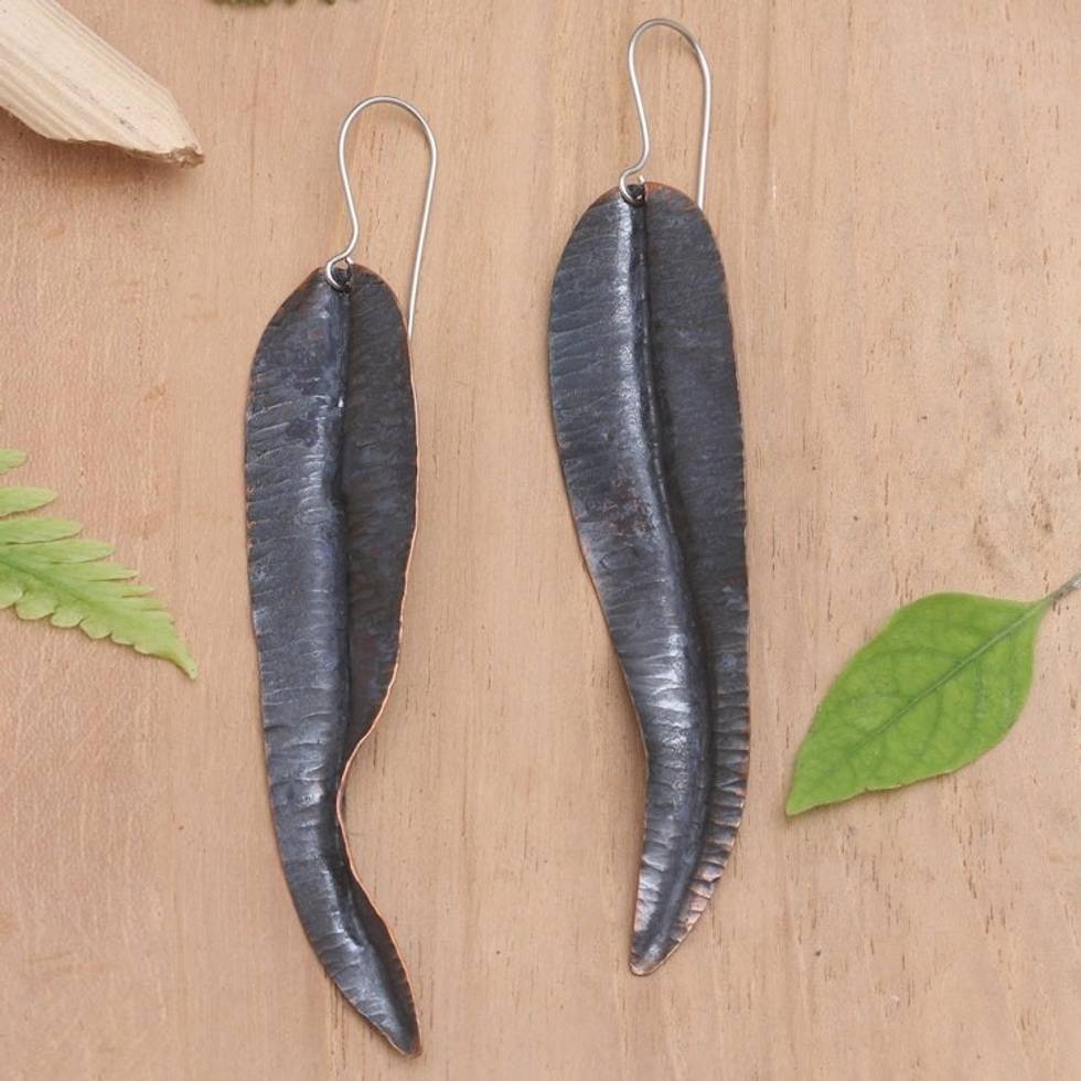 "Shaped like falling leaves, Agus Suryanto's dangle earrings feature a cool, vintage look thanks to their oxidized finish. The artisan in Bali uses copper-plated stainless steel to hand craft the earrings, suspending the pair from stainless steel hooks."