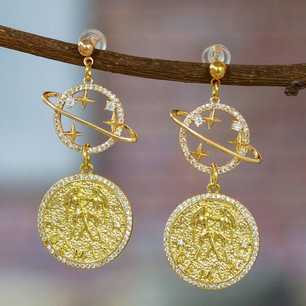 Cosmos-Themed 24k Gold-Plated Brass Gemini Dangle Earrings 'Gemini Galaxy' Item ID: 2671807802
