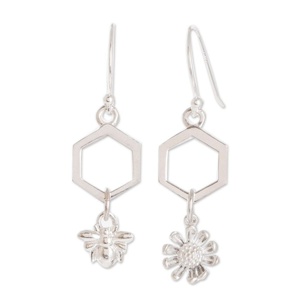 Costa Rican Sterling Silver Bee and Flower Dangle Earrings 'Honeycomb Flower' Item ID: 2671771717