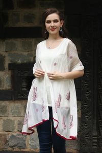 "Chikan is a traditional style of embroidery used in India, where patterns are block-printed onto pieces of clothing before being embroidered. Uma Tripathi designs this shawl, which is woven from cotton and silk blend fibers in a champagne color with beautiful floral chikan embroidery in wine."