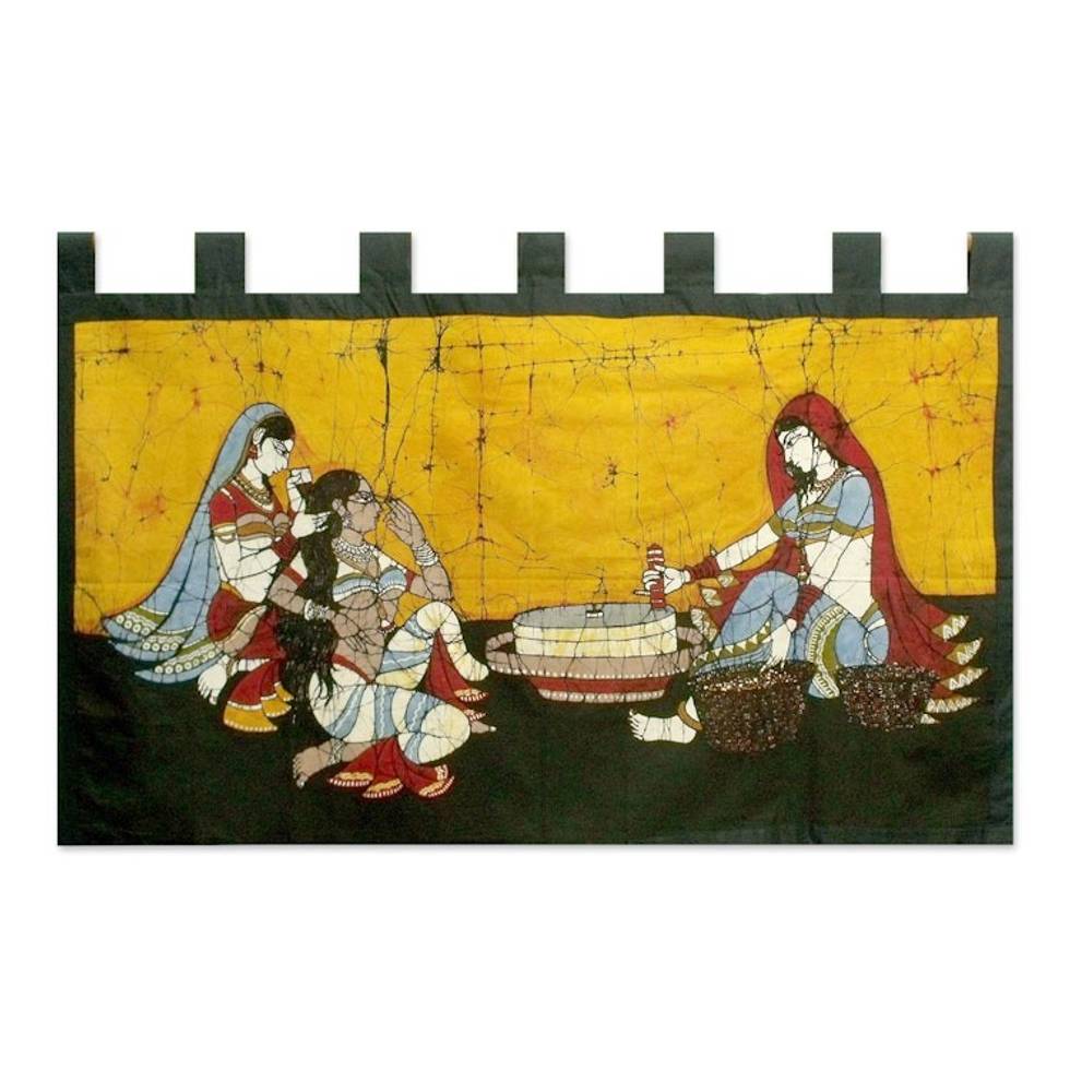 Cotton batik wall hanging 'Chores and Chitchat' Item ID: 2671794221