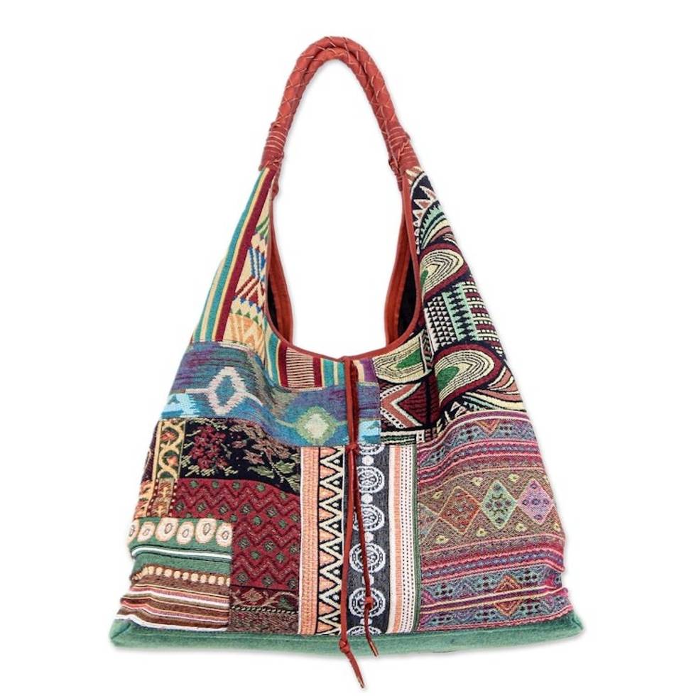 Cotton Blend and Leather Accented Hobo Handbag 'Natural Geometry' Item ID: 2671640777