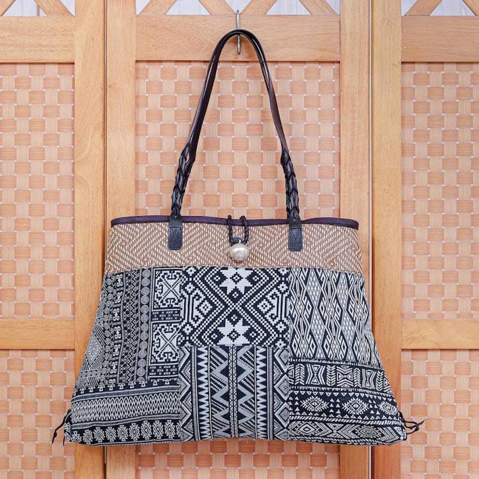 Cotton Blend Geometric-Motif Shoulder Bag 'Shopping Day in Black' Item ID: 2676651208