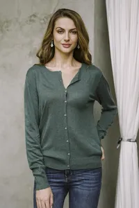 Cotton Blend Green Cardigan Sweater from Peru 'Simple Style in Jade' Item ID: 2669904588