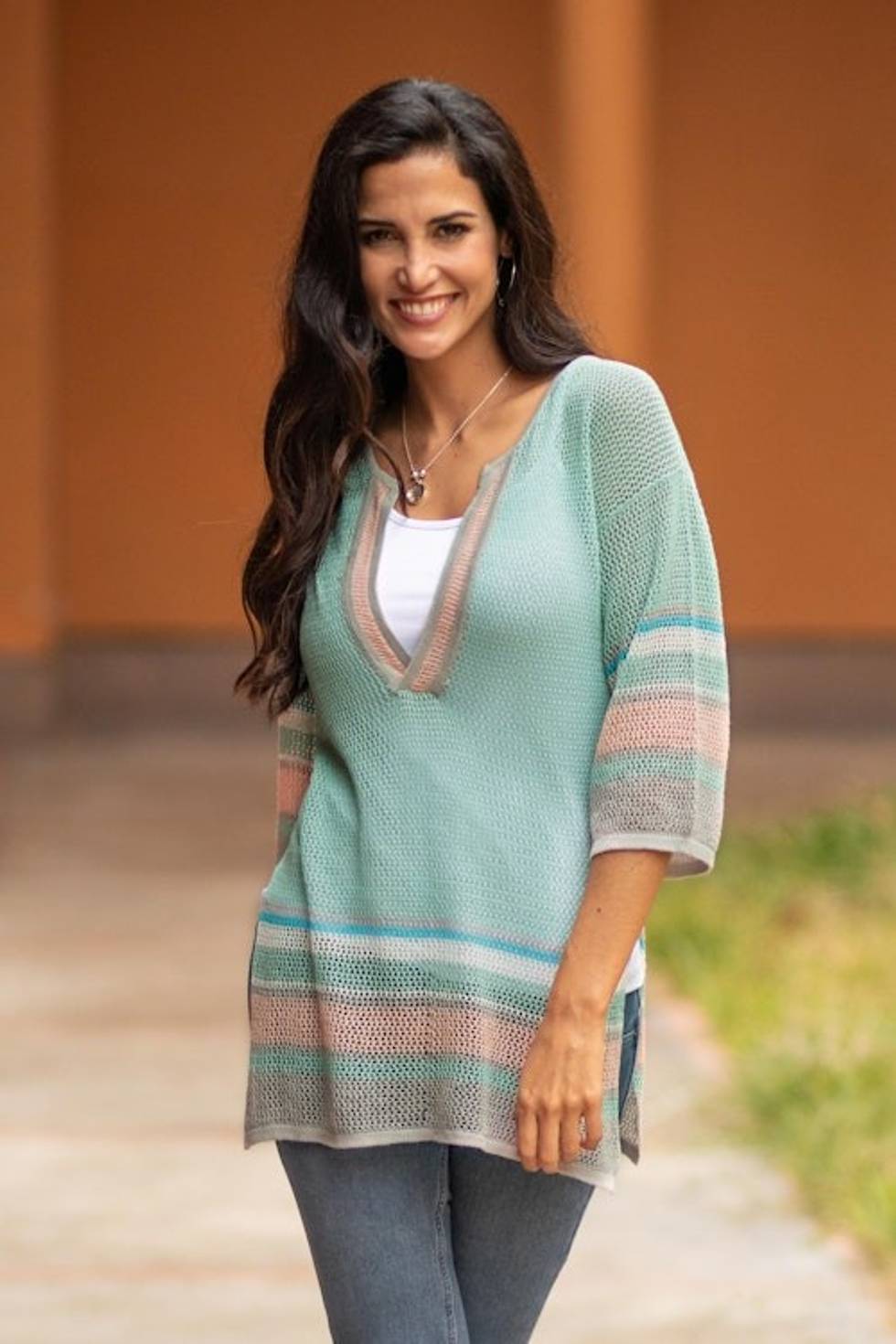 Cotton-Blend Loose-Knit Turquoise Tunic From Lima Peru 'Mint Spring' Item ID: 2669891434
